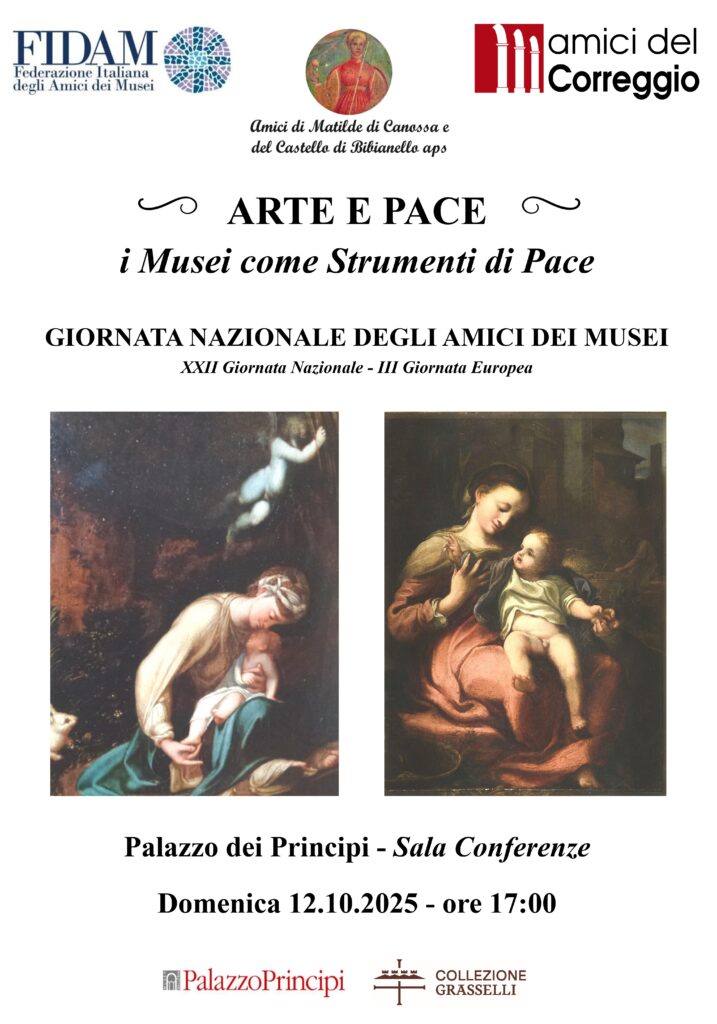 Le associazioni Amici del Correggio e del Museo “Il Correggio” insieme agli Amici di Matilde di Canossa e del castello di Bianello aps con l’evento ARTE E PACE- I Musei come strumenti di pace celebrano insieme la III Giornata Europea degli Amici dei Musei e la XXII Giornata Nazionale FIDAM dedicandola a due opere di Antonio Allegri, detto il Correggio, che in versione antica sono esposte all’interno del Museo ”Il Correggio”. Le associazioni hanno ritenuto importante unirsi in una sola azione comune per dare il loro apporto alla manifestazione e per sottolineare anche come collaborare sia un valore aggiunto per gli associati FIDAM.