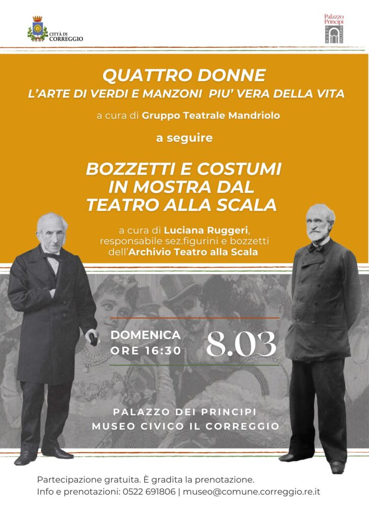 - Alle ore 16:30 presso le Gallerie Espositive di Palazzo dei Principi: Quattro donne, l’arte di Verdi e Manzoni più vera della vita, a cura di Gruppo Teatrale Mandriolo.