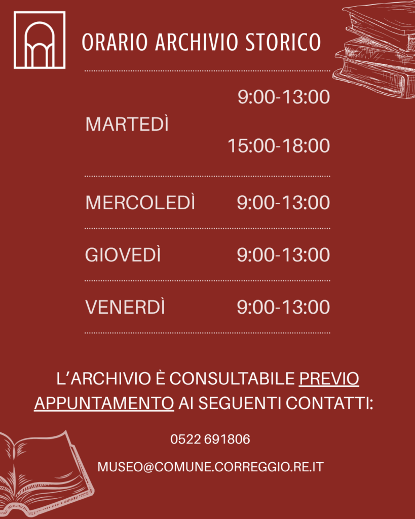 Per la consultazione dei fondi archivistici degli Archivi Storici della Città di Correggio è necessaria la prenotazione: la richiesta va effettuata via mail all’indirizzo museo@comune.correggio.re.it con l’indicazione della documentazione di interesse alcuni giorni prima della data presunta di effettiva consultazione.