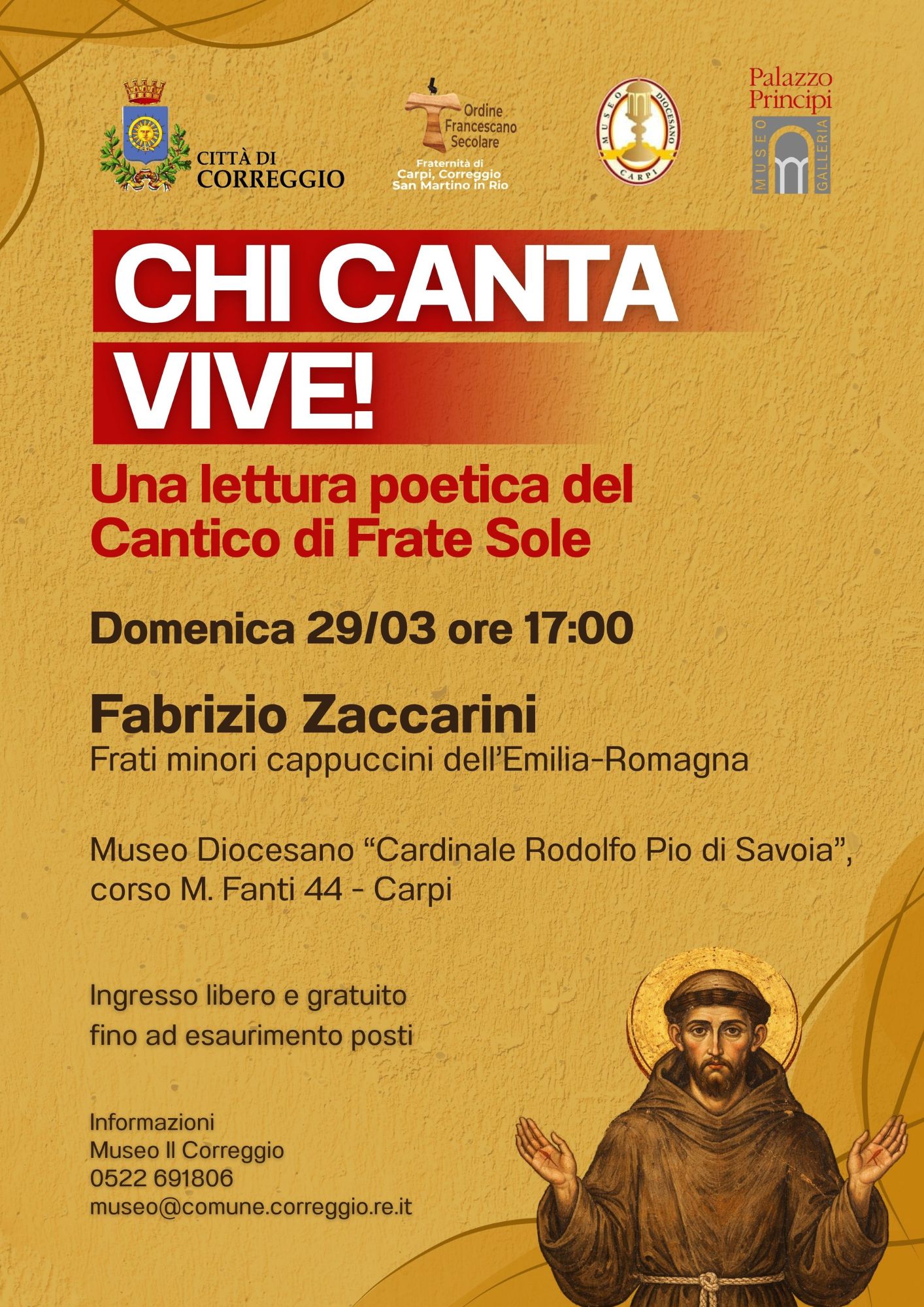 L’evento, intitolato Chi canta vive! – Una lettura poetica del Cantico di Frate Sole, si terrà domenica 29 marzo alle ore 17.00 presso il Museo Diocesano Cardinale Rodolfo Pio di Savoia, in Corso M. Fanti 44, Carpi.