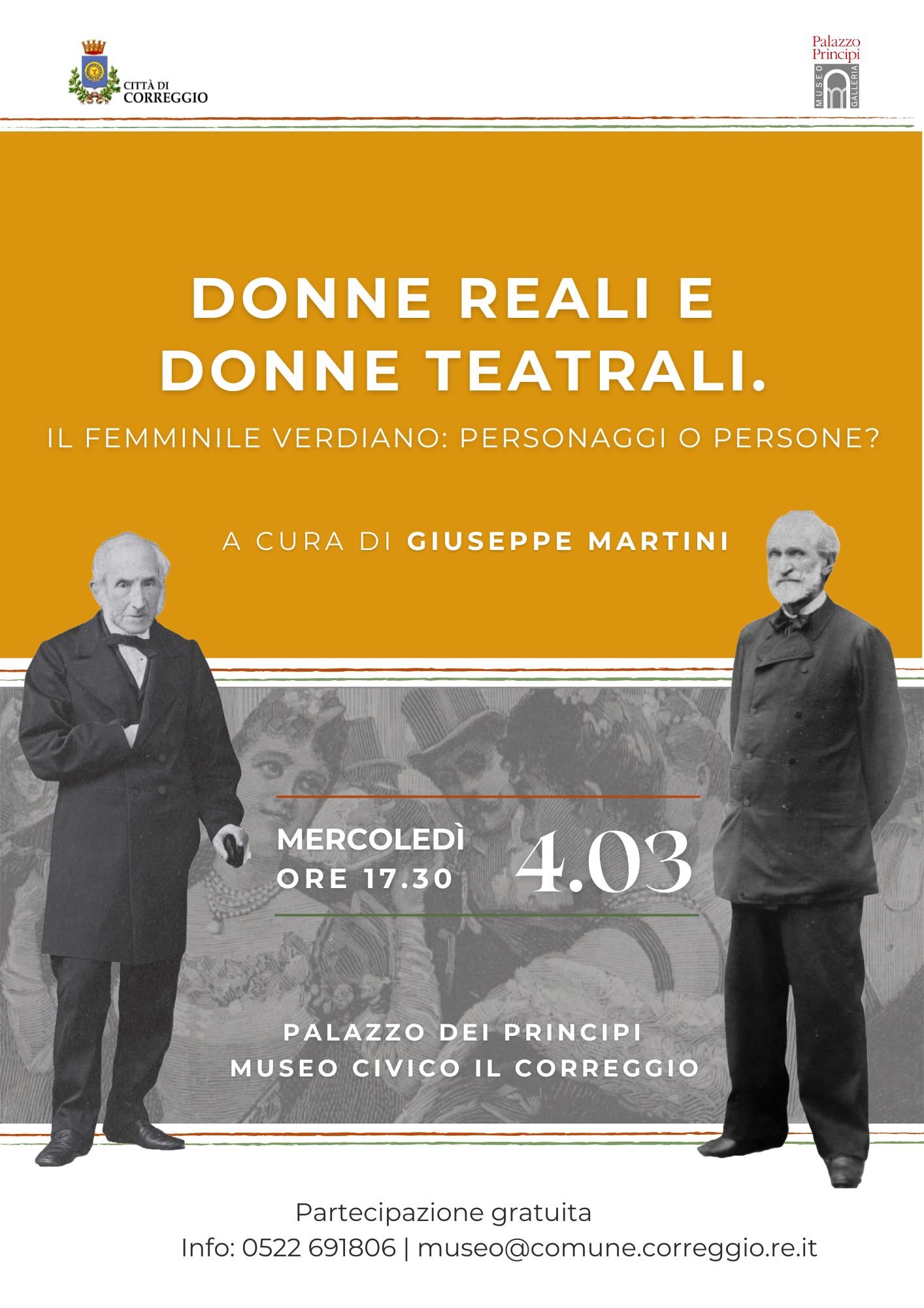Donne reali e donne teatrali. Il femminile verdiano: personaggi o persone? A cura di Giuseppe Martini Palazzo dei Principi | Sala Conferenze Mercoledì 4 marzo, ore 17:30 Partecipazione libera e gratuita. Per informazioni: Museo Civico Il Correggio 0522691806 | museo@comune.correggio.re.it