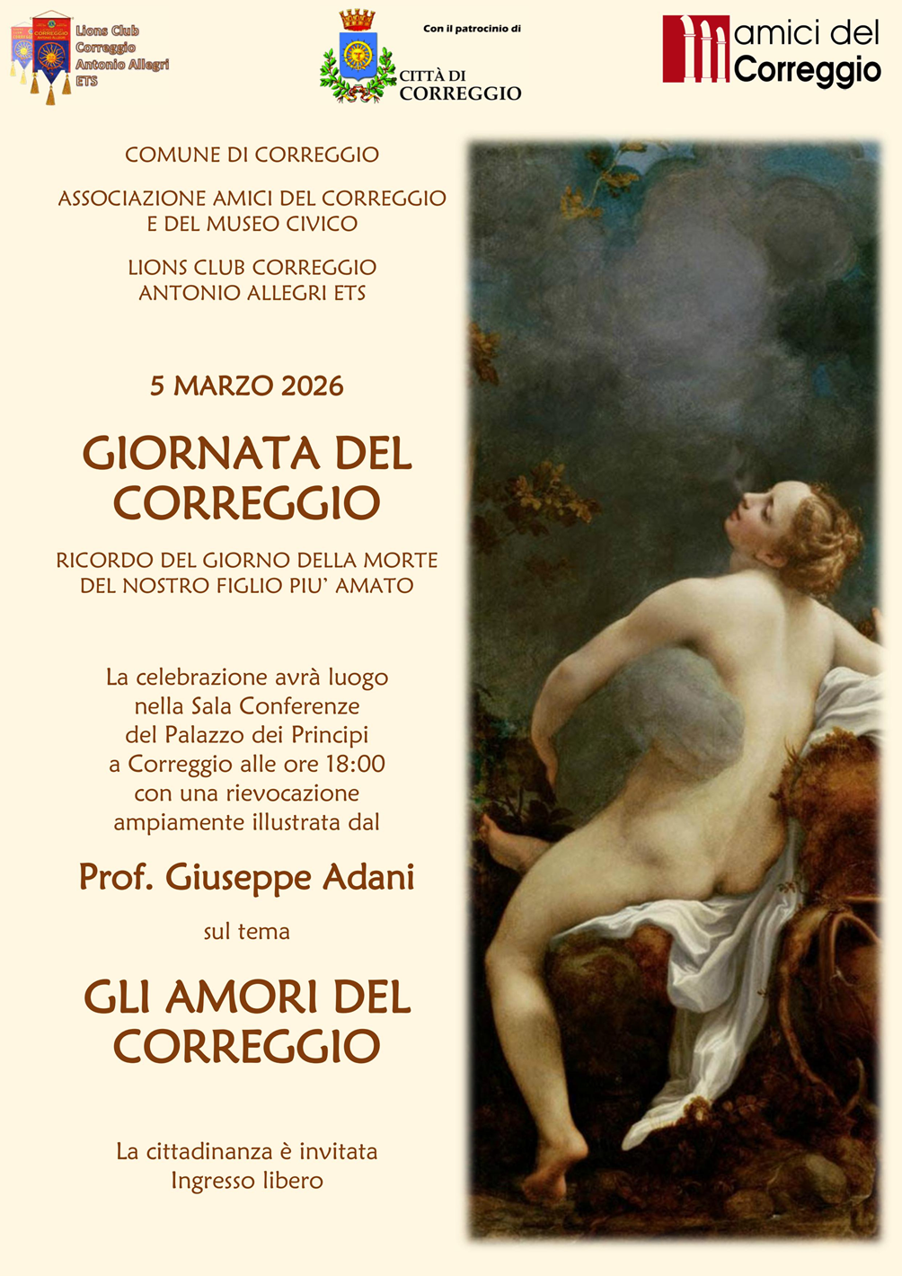 Nell’anniversario della morte di Antonio Allegri, il Comune di Correggio, il Lions Club Correggio, l’associazione “Amici del Correggio” e il Museo Civico “Il Correggio” vi invitano giovedì 5 marzo dalle ore 18:00 presso la Sala Conferenze di Palazzo dei Principi per una rievocazione illustrata dal Prof. Giuseppe Adani sul tema Gli amori del Correggio.