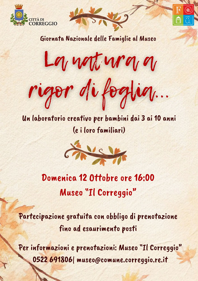 E il nostro Museo desidera vivere questa giornata con i bambini e i loro familiari invitandoli ad un divertentissimo laboratorio ispirato all’autunno e ai suoi vivaci e variegati colori. La natura a rigor di foglia vi attende domenica 12 ottobre alle ore 16:00 presso il Museo Il Correggio. Daremo vita a creazioni uniche utilizzando foglie, materiali naturali e di riciclo, per esprimere la fantasia e la creatività di ciascuno.