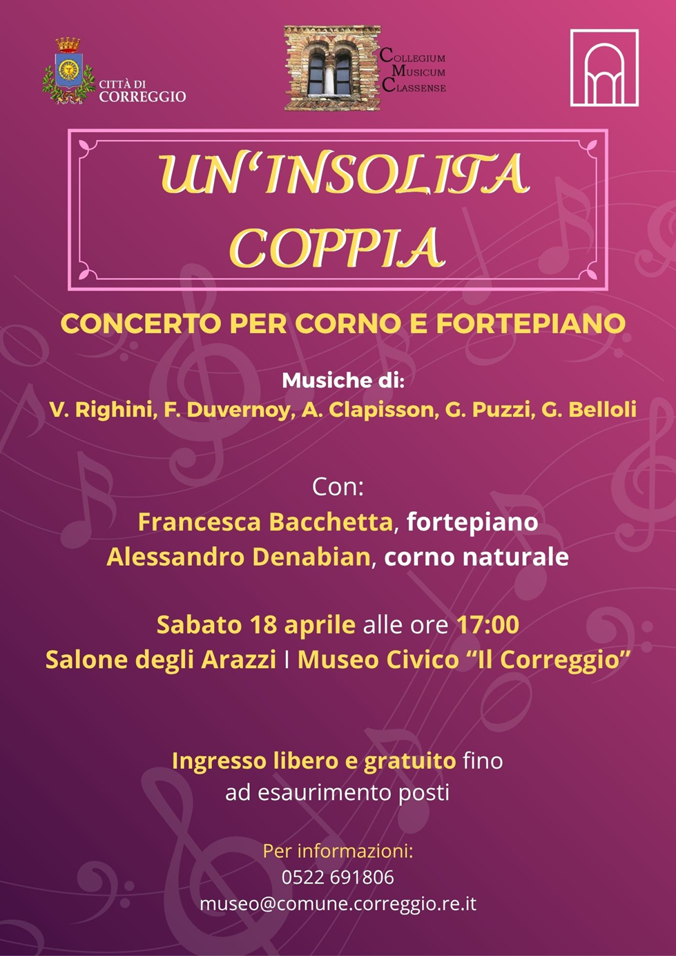 Sabato 18 aprile alle ore 17:00 presso il Salone degli Arazzi del Museo Civico Il Correggio si terrà il terzo appuntamento della rassegna Tasti, serie di concerti dedicata alle tastiere antiche a cura dell’Associazione Collegium Musicum Classense.